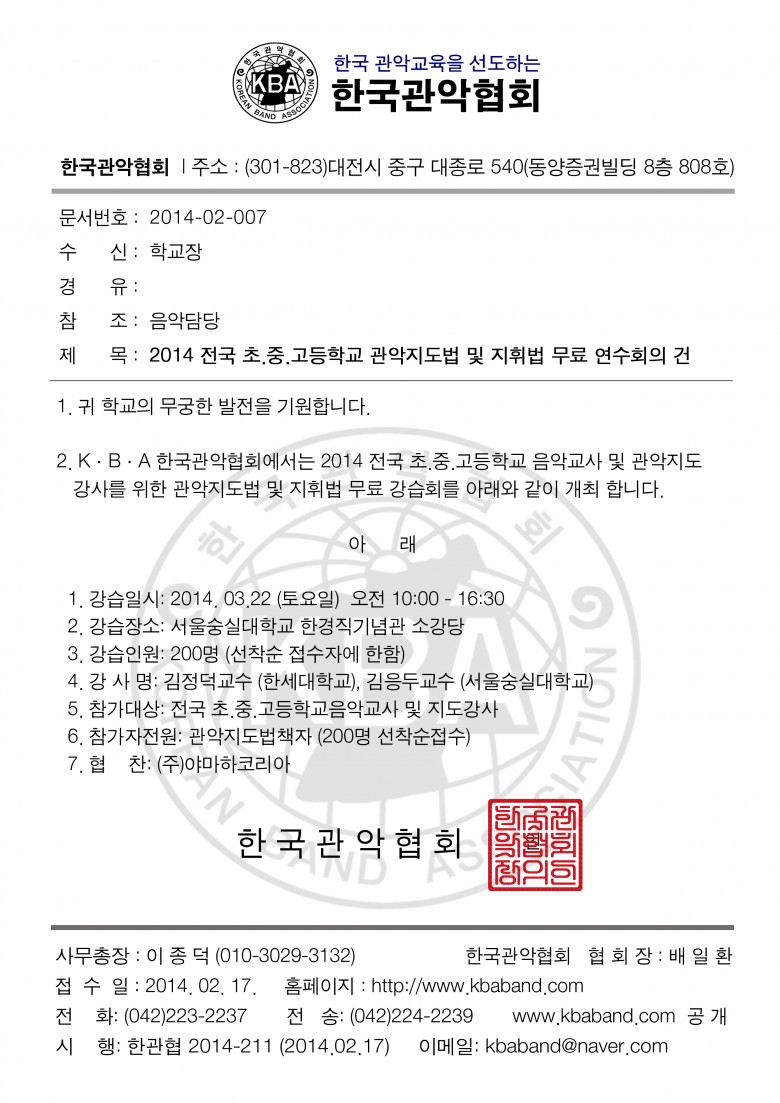 2014 전국.초.중.고등학교 관악지도법 및 지휘법 무료 연수회 페이지 정보 작성자 한국관악협회 (222.♡.104.103) 작성일14-02-24 11:30 조회4,946회 댓글0건 관련링크 이전글 다음글 목록 본문 2014 전국.초.중.고등학교 관악지도법 및 지휘법 페이스북 공유 트위터 공유 구글+ 공유 댓글목록 등록된 댓글이 없습니다. 이전글 다음글 목록