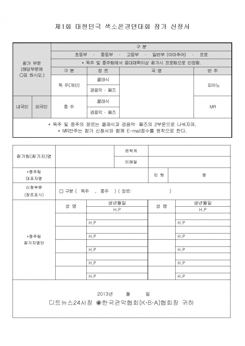 제1회 디트뉴스24시 사장배 대한민국 색소폰 경연대회 참가신청서