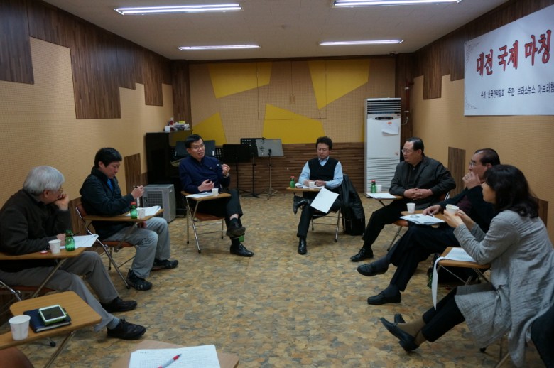 김영방 교수, KBA 사무총장 이종덕, 김은혜 교수, 체제승 교수, 브라스뉴스 편집장 김계혁, 야마하코리아 김수관 차장, KBA 중앙이사 유성호 등 여러분들이 2013년 대전에서 1회로 개최될 대전 월드 인터네셔널 마칭 페스티벌 포럼 & 간담회를 가졌습니다.