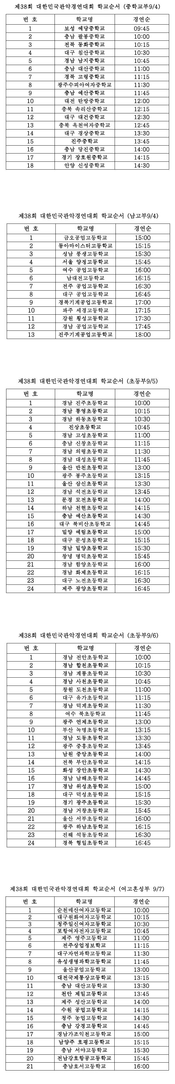 제38회 대한민국 관악경연대회 학교별 경연순서