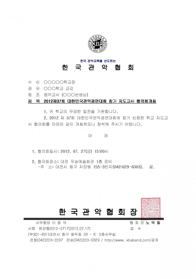 2012제37회 대한민국관악경연대회 지도교사 협의회 개최 공문