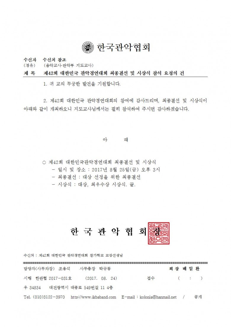 출장공문-대한민국관악경연대회 최종결선 및 시상식 참석 페이지 정보 작성자 사무총장 (223.♡.138.218) 작성일17-08-24 14:29 조회4,118회 댓글0건 관련링크 이전글 다음글 목록 본문 페이스북 공유 트위터 공유 구글+ 공유 댓글목록 등록된 댓글이 없습니다. 이전글 다음글 목록