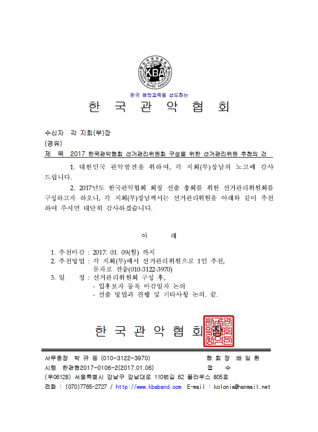 2017 한국관악협회 선거관리위원회 구성을 위한 선거관리위원 추천 공지 페이지 정보 작성자 한국관악협회 (58.♡.71.110) 작성일17-01-06 17:18 조회4,225회 댓글0건 관련링크 이전글 다음글 목록 본문 페이스북 공유 트위터 공유 구글+ 공유 댓글목록 등록된 댓글이 없습니다. 이전글 다음글 목록