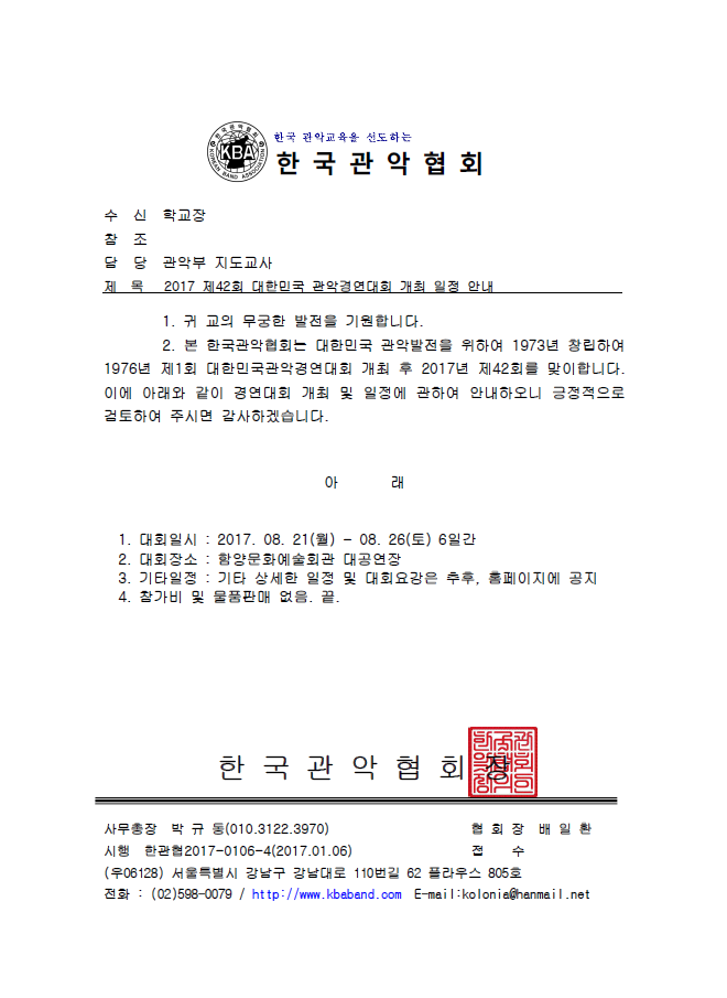 2017 제42회 대한민국 관악경연대회 개최 일정 안내 페이지 정보 작성자 한국관악협회 (58.♡.71.110) 작성일17-01-06 17:32 조회4,411회 댓글0건 관련링크 이전글 다음글 목록 본문 페이스북 공유 트위터 공유 구글+ 공유 댓글목록 등록된 댓글이 없습니다. 이전글 다음글 목록