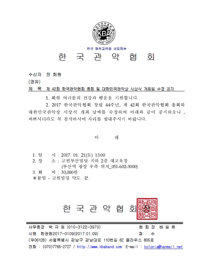 제 42회 한국관악협회 총회 및 대한민국관악상 시상식 개최일 수정 공지 페이지 정보 작성자 한국관악협회 (58.♡.71.110) 작성일17-01-09 11:50 조회4,395회 댓글0건 관련링크 이전글 다음글 목록 본문 페이스북 공유 트위터 공유 구글+ 공유 댓글목록 등록된 댓글이 없습니다. 이전글 다음글 목록